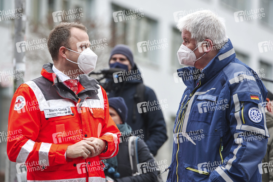 Mario Czaja (Präsident Berliner Landesverband Deutsches Rotes Kreuz, DRK) und Albrecht Brömme (Impfzentren-Koordinator) bei der Inbetriebnahme des Corona-Impfzentrums in der Arena Berlin. Berlin, 27.12.2020