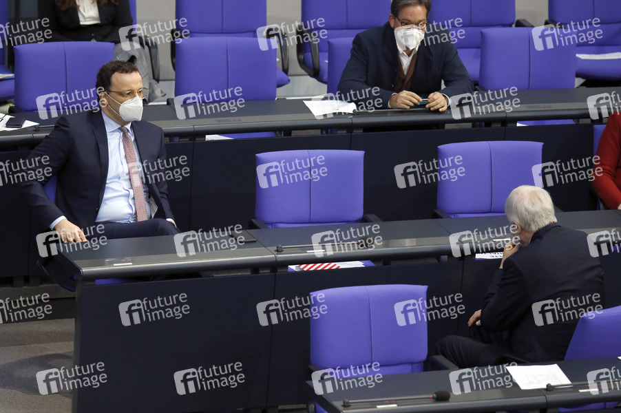 Horst Seehofer und Jens Spahn in der 210. Sitzung des Deutschen Bundestages im Reichstagsgebäude. Berlin, 12.02.2021