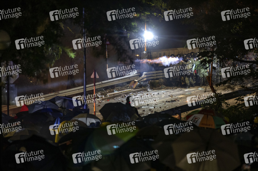 Polizei schießt von der No.2 Bridge auf Studenten - Kampf an der Chinese University Hong Kong (CUHK). Hongkong protestiert seit fünf Monaten ununterbrochen. Am Montag, dem 11. November 2019, begann ein Streik in der ganzen Stadt, der Teile von Hongkong zum Erliegen brachte, als MTR-Stationen geschlossen und mehrere Straßensperren errichtet wurden. Hongkong, 12.11.2019