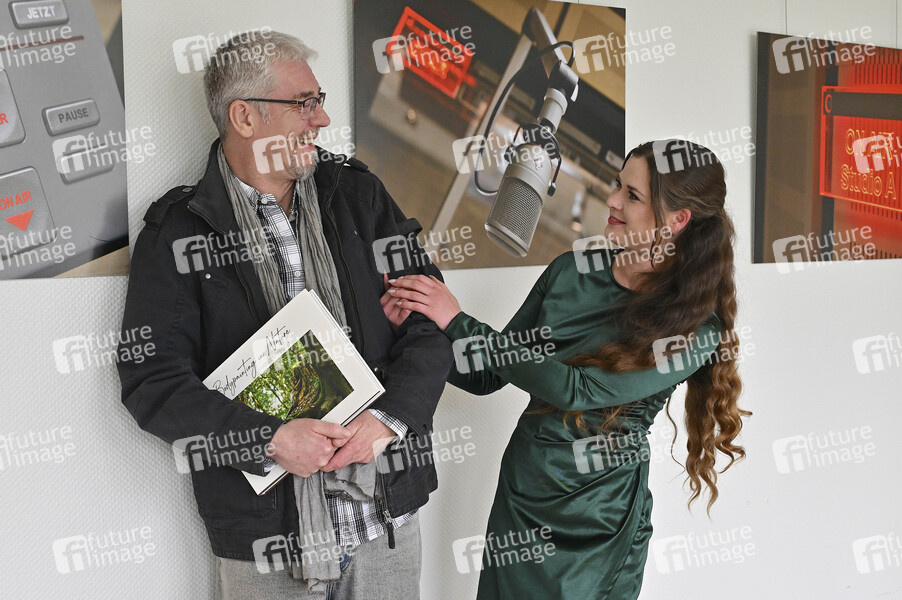 Jörg Düsterwald mit Model Tatjana Heinz beim Interview zum Fotobildband 'Bodypainting in Nature - Farbige Symbiosen' in der Radiosendung 'NDR 1 Niedersachsen - Kulturspiegel' im NDR Landesfunkhaus. Hannover, 13.02.2024