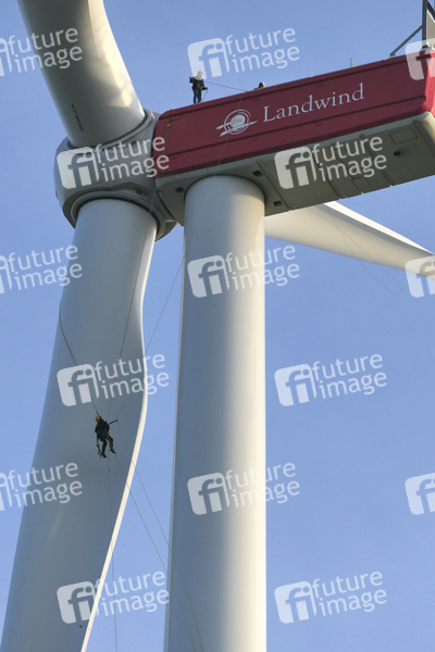 Arbeiter bei Wartungs- und Überprüfungsarbeiten in schwindelnder Höhe an einem Windrad. Dahle, 16.10.2024