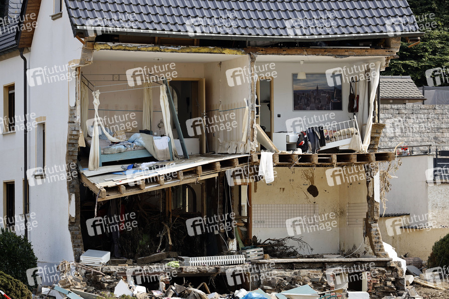 Nach dem Jahrhunderthochwasser in der Eifel durch heftige Regenfälle und Dauerregen mit Überschwemmungen und Überflutungen haben die Aufräumarbeiten im Ahrtal begonnen. Einheiten von Polizei, THW, Bundeswehr und Feuerwehr mitsamt vielen freiwilligen Helfern räumen Straßen, entfernen Schutt und Schlamm und versorgen die Menschen. Im Bild zerstörte Häuser an der Uferpromenade in der Ortschaft Dernau, in der die Flut viele Häuser zerstörte, 22.07.2021