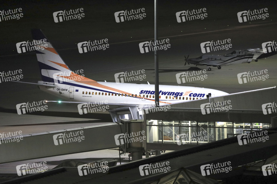 Eine Boeing 737 der Fluggesellschaft Smartwings landet nach 21 Uhr auf dem Flughafen Leipzig/Halle. Mit der Maschine sind auch ehemalige Ortskräfte deutscher Institutionen aus Afghanistan in Leipzig gelandet. Per Flugzeug werden ehemalige Ortskräfte sowie besonders gefährdete Menschen, etwa Menschenrechtsanwälte oder Frauenrechtlerinnen, nach Deutschland geholt. Leipzig, 16.04.2025
