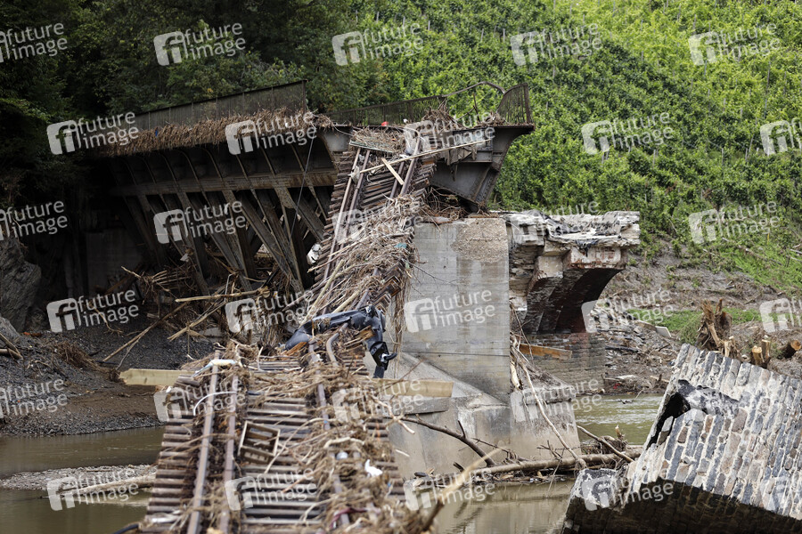 Nach dem Jahrhunderthochwasser in der Eifel durch heftige Regenfälle und Dauerregen mit Überschwemmungen und Überflutungen haben die Aufräumarbeiten im Ahrtal große Fortschritte gemacht. Einheiten von Polizei, THW, Bundeswehr und Feuerwehr mitsamt vielen freiwilligen Helfern haben Straßen geräumt, Schutt und Schlamm entfernt und die Menschen versorgt. Der Wiederaufbau wird trotzdem Jahre dauern. Im Bild Flutschäden an einer Brücke zwischen Rech und Mayschoß, die durch die Flut beschädigt wurde, 08.08.2021
