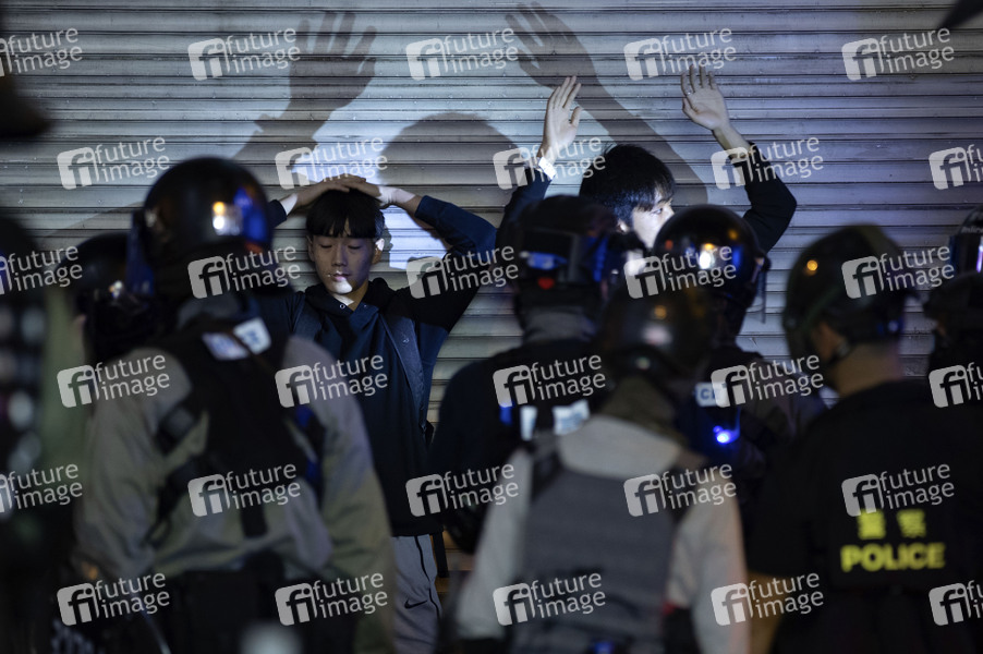 Polizei hält zwei Demostranten fest im Tsuen Wan Bezirk. Sonntagskämpfe zwischen Demonstranten und Polizei finden in und um Einkaufszentren in verschiedenen Stadtteilen statt. Es ist der fünfte Monat in Folge, seitdem in Hongkong die Proteste andauern, die durch ein nun zurückgezogenes Auslieferungsgesetz ausgelöst wurden. Dieser Protest hat sich jedoch zu einer breiteren Forderung nach demokratischen Reformen und unabhängigen polizeilichen Ermittlungen sowie zu anderen Forderungen entwickelt. Carrie Lam erlies ein Verbot der Gesichtsbedeckung mit Wirkung zum 5. Oktober. Bürger versammeln sich in verschiedenen Einkaufszentren und Stadtteilen, um zu protestieren. Hongkong, 10.11.2019