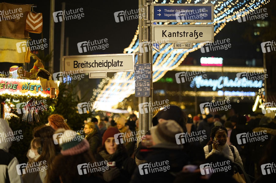 Straßenschilder Breitscheidplatz und Kantstraße am 39. Weihnachtsmarkt an der Gedächtniskirche am Breitscheidplatz. Berlin, 07.12.2022