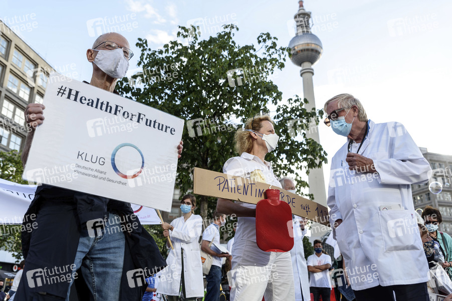 Berlin4Future - Ärzte von Health for Future bei der Kundgebung für mehr Klimaschutz am Berliner Alexanderplatz. Die Bewegung Berin4Future sieht sich als Pendant der Bewegung Fridays For Future für Erwachsene und Berufstätige. Auch sie fordern die Einhaltung des Pariser Klimaschutzabkommens und den Kohleausstieg. Berlin, 03.08.2020