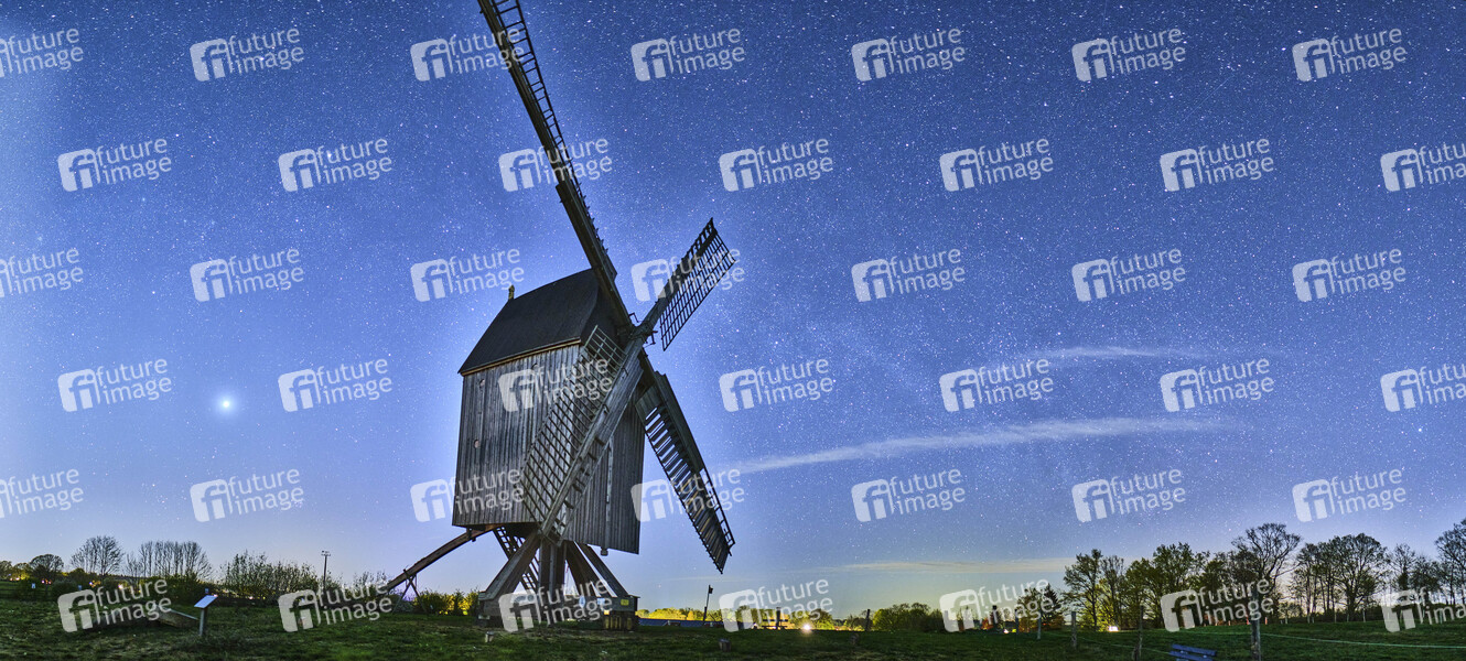 Sehenswürdigkeit, Sightseeing, Mühle, Windmühle, funktionsfähiges kulturhistorisches Denkmal, Ständermühle, Kastenmühle, Mühlenhaus, Hausbaum, technisches Bauwerk, Flügle, Windmühlenflügel, Windenergie, Energieumwandlung, Nacht, Sterne, Sternenhimmel