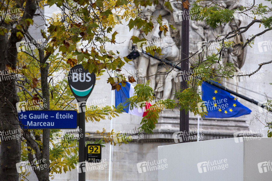 Französische Staatsflagge und Europaflagge bei der 101. Jahrfeier des Waffenstillstands von 1918 am Triumphbogen. Paris, 11.11.2019