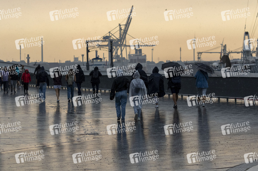 Starke Regenfälle und Gewitter sorgen diesen Sommer vermehrt für Unwetterwarnung: Touristen mit Regenschirmen unterwegs im Regen an den Landungsbrücken im Hafen. Hamburg, 14.08.2024