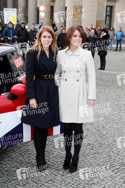 Die Prinzessinnen Beatrice und Eugenie mit einem Mini Cooper unterwegs auf einer Werbetour für ihre britische Heimat am Brandenburger Tor, Berlin