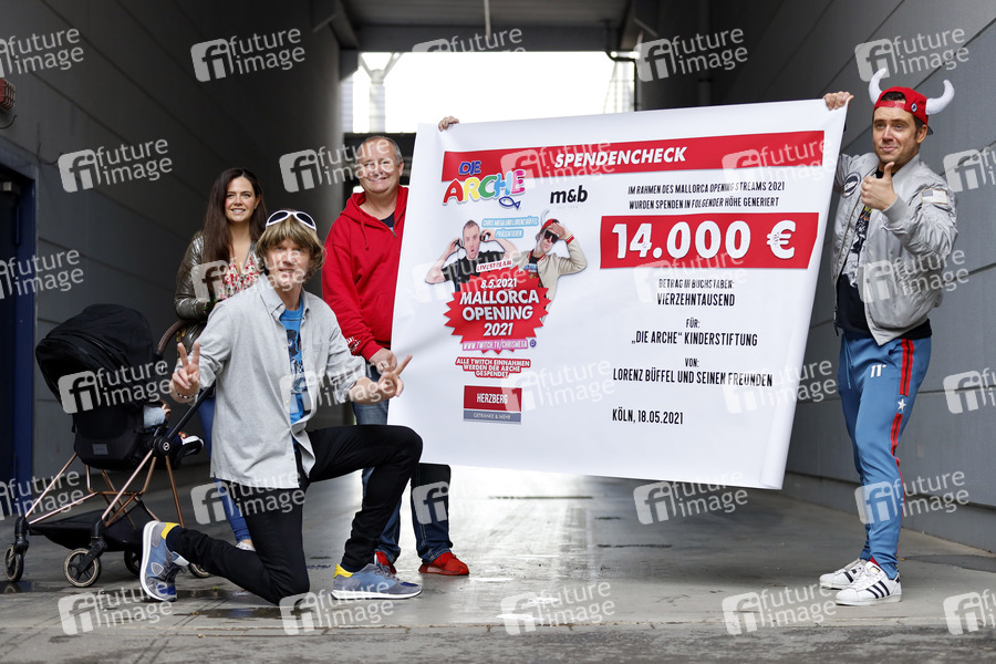 Emily Gierten, Mickie Krause, DJ Düse und Lorenz Büffel bei der Überreichung des Spendenschecks für die Kölner Arche. Mallorca-Stars haben beim großen Mallorca Opening 2021 auf der Streamingplattform Twitch rund 14.000 Euro für den guten Zweck gesammelt. Köln, 18.05.2021