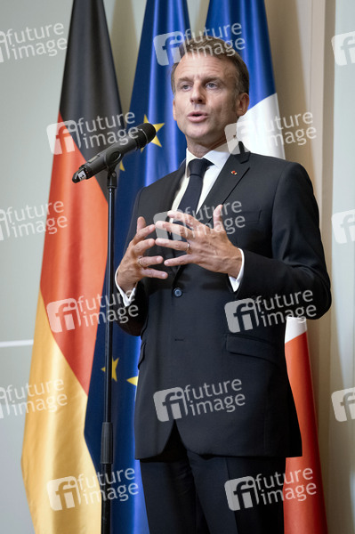Emmanuel Macron beim Empfang des französischen Staatspräsidenten zu einem gemeinsamen Gespräch mit dem Bundeskanzler mit anschließendem Pressestatement in der Borsig-Villa am Tegeler See. Berlin, 23.07.2025