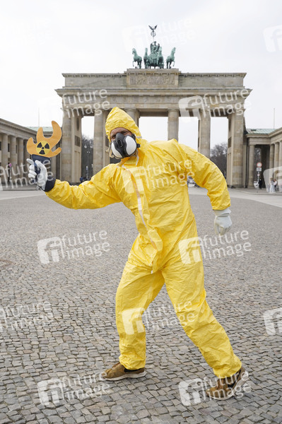 Aktivisten mit Strahlenschutzanzügen bei der Fotoaktion 'Radioactive Olympics - Solidarität mit den Betroffenen von Fukushima' am Brandenburger Tor. Berlin, 24.03.2021