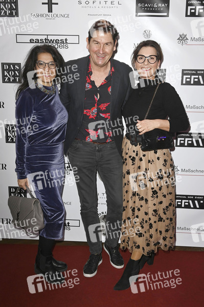 Sevgi Schäfer, Carlos Streil und Gast bei der Eröffnung der Frankfurt Fashion Lounge mit der Opening Show by Wladimir Arutti im Rahmen der Frankfurt Fashion Week Herbst/Winter 2022 im Sofitel Frankfurt Opera. Frankfurt, 18.01.2022