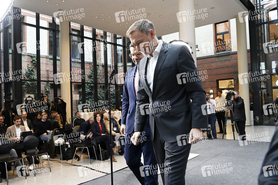 Marco Buschmann und Christian Lindner bei der Presseskonferenz der FDP zur Vorstellung des neuen Generalsekretärs Marco Buschmann im Hans-Dietrich-Genscher-Haus. Berlin, 02.12.2024
