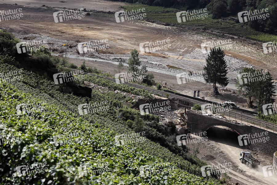 Nach dem Jahrhunderthochwasser in der Eifel durch heftige Regenfälle und Dauerregen mit Überschwemmungen und Überflutungen haben die Aufräumarbeiten im Ahrtal große Fortschritte gemacht. Einheiten von Polizei, THW, Bundeswehr und Feuerwehr mitsamt vielen freiwilligen Helfern haben Straßen geräumt, Schutt und Schlamm entfernt und die Menschen versorgt. Der Wiederaufbau wird trotzdem Jahre dauern. Im Bild Flutschäden an einer Eisenbahnbrücke nahe der Ortschaft Rech, in der die Flut viele Häuser zerstörte, 30.07.2021