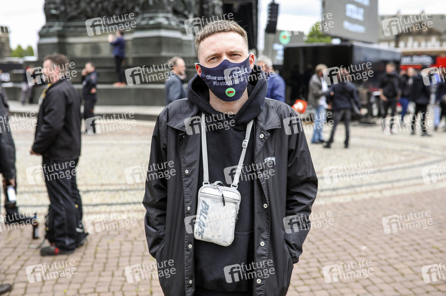 DJ ESKEI83 bei der Demonstration 'Ohne uns ist Stille' der Organisation 'Leere Stühle' auf dem Theaterplatz in der historischen Dresdner Altstadt. Künstler, Veranstalter und Unternehmen der Veranstaltungsbranche wie Caterer und Techniker demonstrieren gemeinsem, um auf die Probleme und Wichtigkeit ihrer Branche aufmerksam zu machen. Dredsen, 05.06.2020