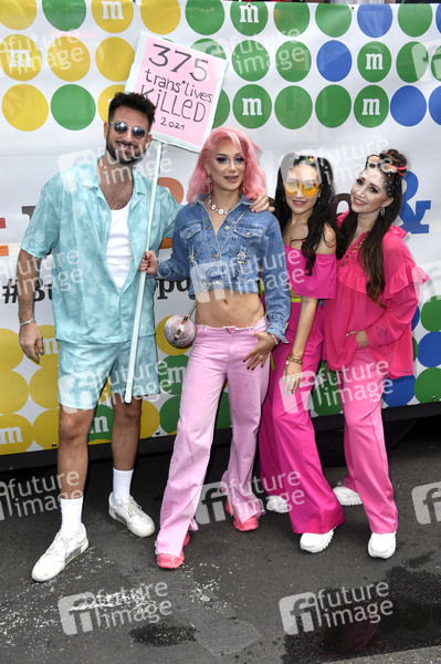 Alexander Schäfer und Candy Crash mit Gästen vor dem M&M's Truck bei der 44. Christopher Street Day Parade 2022 unter dem Motto 'United in Love! Gegen Hass, Krieg und Diskriminierung' vom Spittelmarkt auf gut sieben Kilometern über Potsdamer Platz und Potsdamer Straße zum Nollendorfplatz, von dort weiter zur Siegessäule und zum Brandenburger Tor. Berlin, 23.07.2022