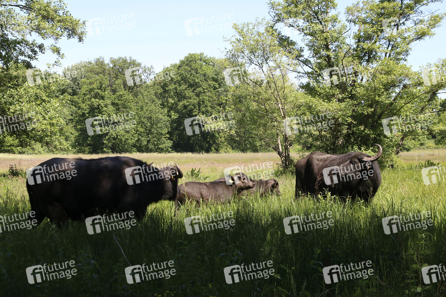 Natur, Umweltschutz, Tierschutz, Wildpflanzenschutz, Tiere, Rinder, Wildrinder, Rind, Bubalus arnee, Bovinae, Stirnwaffenträger, Hornträger, Asiatische Büffel, Wiese, Weide, Insel, Havel