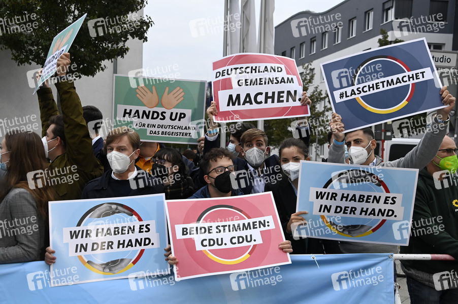 CDU-Anhänger beim 'Triell - Dreikampf ums Kanzleramt' von ProSieben, SAT.1 und Kabel Eins mit den Kanzlerkandidaten im Studio Berlin-Adlershof. Berlin, 19.09.2021