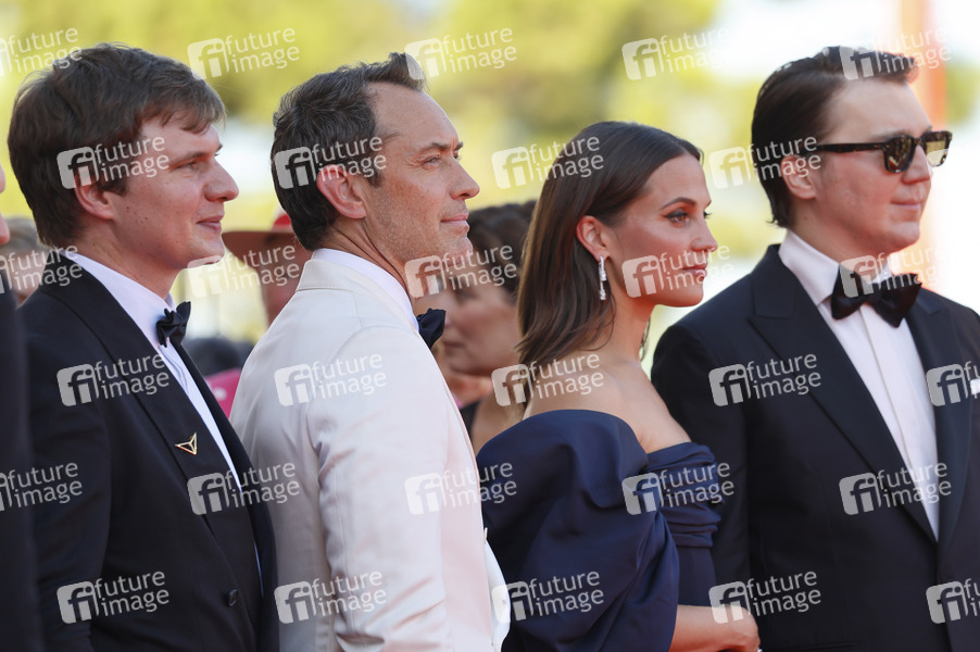 Andrei Zayats, Jude Law, Alicia Vikander und Paul Dano bei der Premiere des Kinofilms 'La Mage du Kremlin / The Wizard of the Kremlin' auf der Biennale di Venezia 2025 / 82. Internationale Filmfestspiele von Venedig im Palazzo del Cinema. Venedig, 31.08.2025