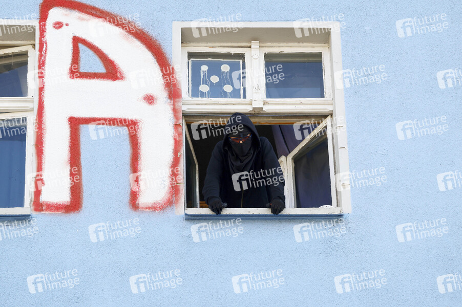 Eingang, Hausbesetzer, Linksextreme, Linkes Wohnprojekt, Linksextremismus, Brandschutz, Räumung, Räumungsklage, Brandschutzgutachten, Begehung, teilbesetztes Haus, Firma Lafone Investments Ltd., Eigentümer, Hauseigentümer, Wahlkampfthema, Berliner Senat, Berliner Politik, linke Szene, Friedrichshain, Brandschutz, Gewalt, Gewaltbereitschaft, Polizei, Polizisten, Polizeieinsatz