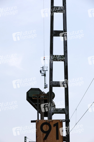 Hauptsignal am Heleikopterhaken beim Fototermin 'Helikopter fliegt Signalmaste für das neue Elektronische Stellwerk in Bonn-Beuel ein'. Es beginnt letzte große Bauphase vor der Generalsanierung der rechten Rheinstrecke im Jahr 2026. Mit Hilfe eines Helikopters werden knapp 50 Signalmaste für das neue ESTW Bonn-Beuel eingeflogen. Bonn, 14.06.2025