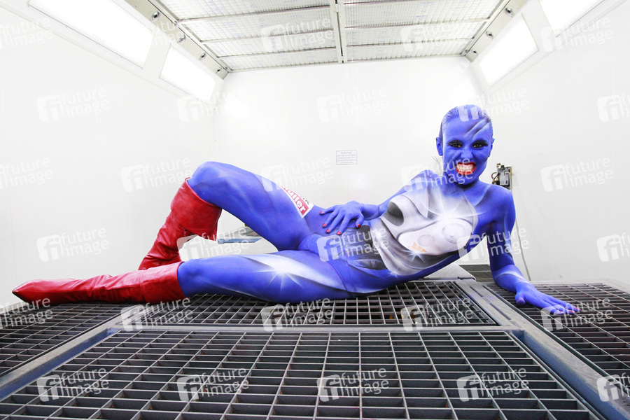 Werbefotos mit Model Caro für die Firma Autotechnik Heinz Müller in Elsdorf im Auftrag der Zoom Werbeagentur Bergheim. Bodypaint Künstler: Jörg Düsterwald
