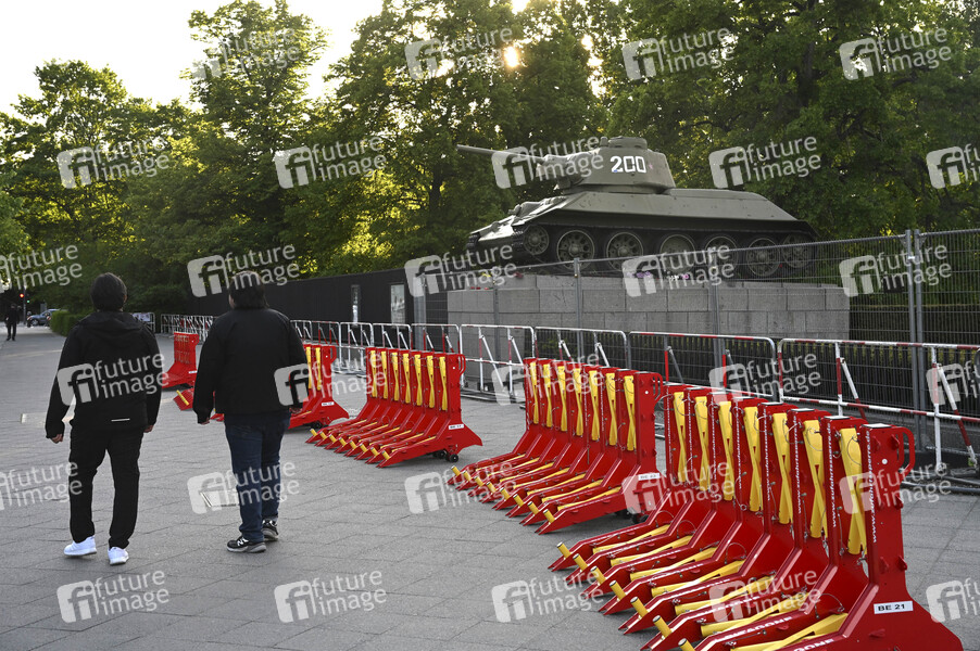 Zufahrssperren am Sowjetisches Ehrenmal Tiergarten. Mobile Sicherheitsperren werden von Institutionen wie Städten, Kommunen, Polizei, Militär und Regierungsbehörden gegen Fahrzeugattacken eingesetzt. (Symbolfoto, Themenfoto) Berlin, 08.05.2025