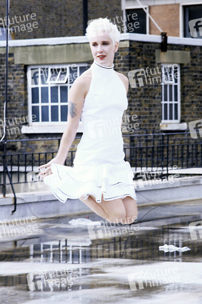 Paula Yates bei einer Modepräsentation auf einem Dach. London, 15.09.1987