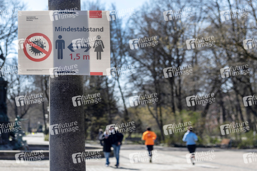 Hinweisschild zum Mindestabstand wegen der Coronakrise im Stadtpark. Nürnberg, 24.03.2020