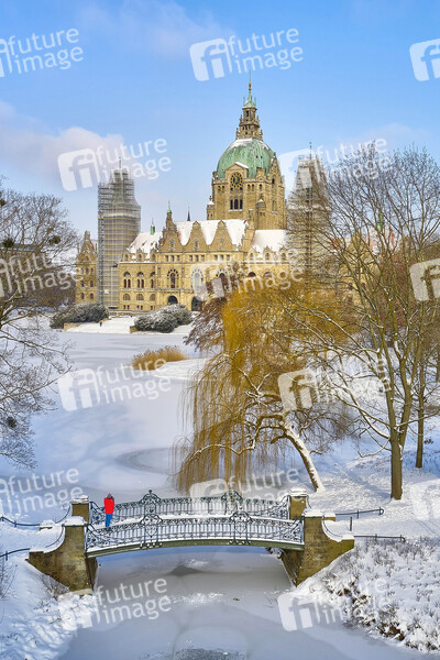 Luftbild vom verschneiten Maschpark mit dem Neuen Rathaus im Winter. (Der Drohnenflug wurde ordnungsgemäß bei der Polizei Leitstelle Hannover angemeldet) Hannover, 09.02.2021