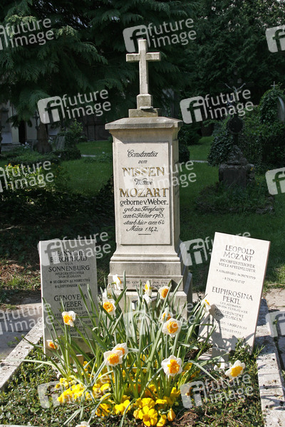 Friedhof St. Sebastian, Grab von Constanze Mozart (Witwe Wolfgang Amadeus Mozarts) & Genovefa Weber (Constanzes Tante und Mutter von Carl Maria von Weber) & Leopold Mozart (Vater Wolfgang Amadeus Mozarts liegt nicht in diesem Grab - sondern wurde in der Kommunalgruft von St. Sebastian beigesetzt)