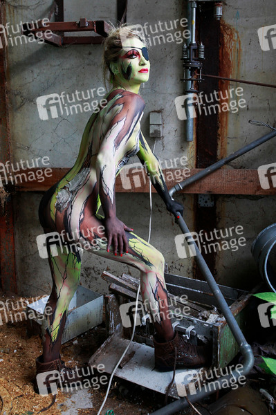 Bodypainting und Photoshooting mit Model Jutta auf einem Industriegelände in Hameln. Bodypaint-Künstler: Jörg Düsterwald, Make-Up und Hairstyling: Nadja Lück