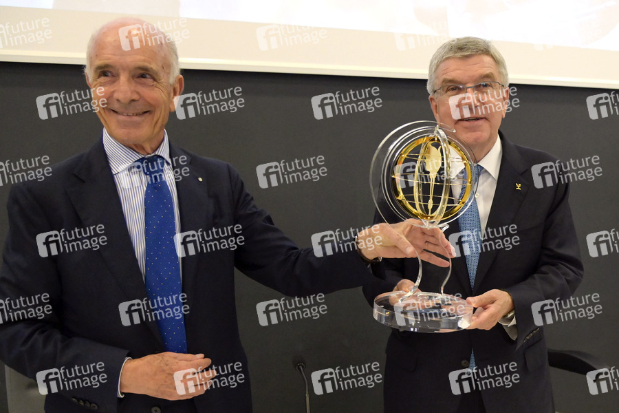Pierre Zappelli überreicht Thomas Bach den Flambeau d'Or Award 2022 des Sportverbands Panathlon International im CONI Center. Rom, 16.09.2022