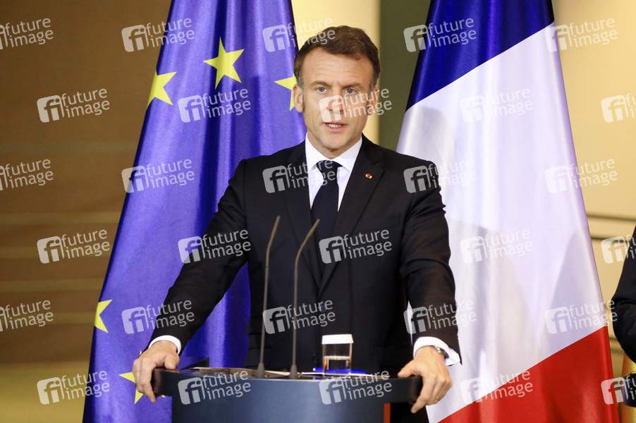 Emmanuel Macron beim Empfang des Staatspräsidenten der Französischen Republik zu einem gemeinsamen Gespräch mit dem Bundeskanzler mit anschließendem Pressestatement im Bundeskanzleramt. Berlin, 18.03.2025