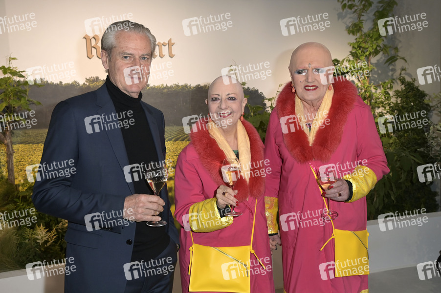 Frederic Dufour und Eva & Adele bei der Ausstellungseröffnung Ruinart Maison 1729 Kunst Pop-up am Tacheles anlässlich des Gallery Weekends. Berlin, 24.04.2024