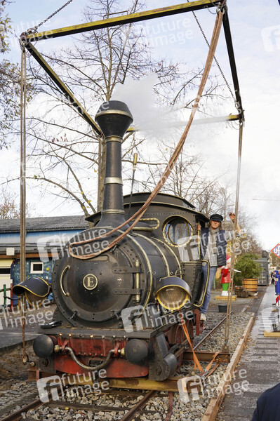 Ein weiteres Filmrequisit für die 'Giant Props' Sammlung ungewöhnlicher Originale, die Lokomotive Emma aus den Jim Knopf Filmen, wird auf der Straße der Giganten im Filmpark Babelsberg aufgestellt. Filmparkchef und 'Lokomotivführer' Friedhelm Schatz organisiert den Transport. Potsdam, 16.11.2020