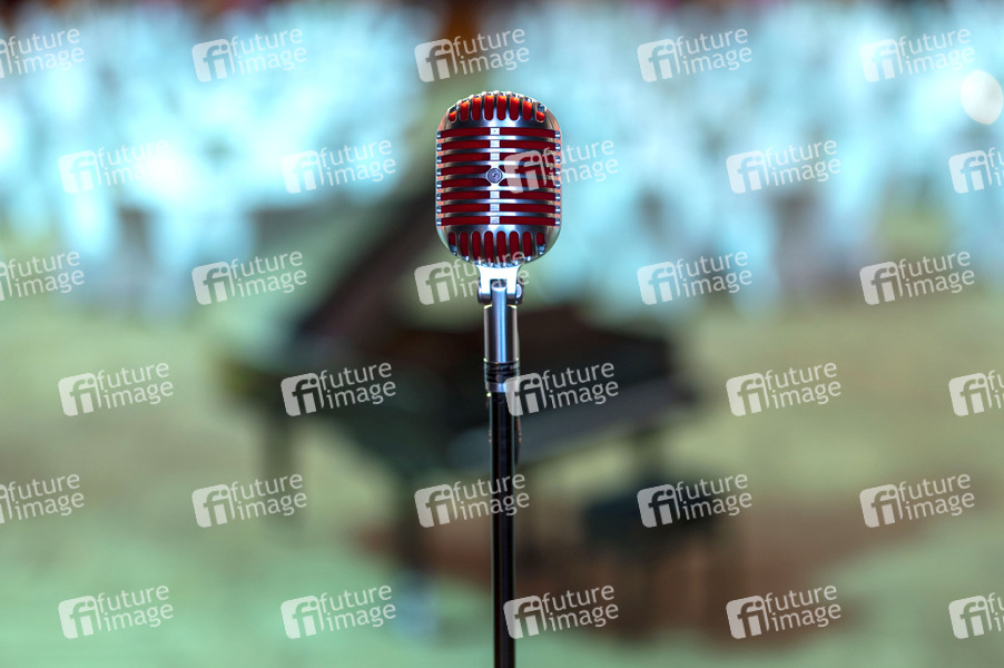 Ein Shure 55SH Mikrofon auf einem Mikroständer vor einem Konzertflügel in der Festhalle Ilmenau. (Symbolfoto, Thmenefoto)
