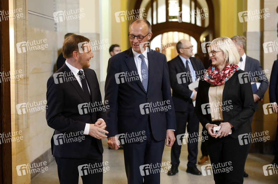 Michael Kretschmer und Friedrich Merz beim Antrittsbesuch des Bundeskanzlers im Freistaat Sachsen in der Sächsischen Staatskanzlei. Dresden, 28.10.2025