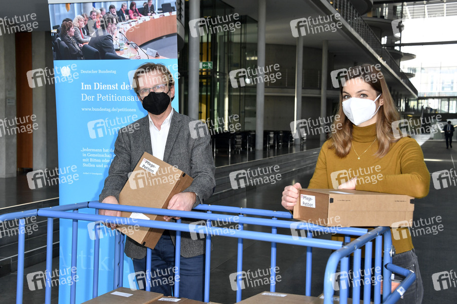 Dr. Bernhard Albrecht und Lena Rautenstrauch bei der Übergabe der Unterschriftenlisten zur Pflege-Petition 'Gesundheitsreform für eine bessere Pflege' an den Petitionsausschuss des Deutschen Bundestags im Paul-Löbe-Haus. Berlin, 11.02.2021