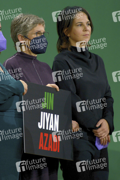Britta Hasselmann und Annalena Baerbock bei einer Solidaritätsbekundung mit den Frauen bei den Protesten im Iran bei der 48. Ordentlichen Bundesdelegiertenkonferenz von Bündnis90/Die Grünen im World Conference Center. Bonn, 15.10.2022