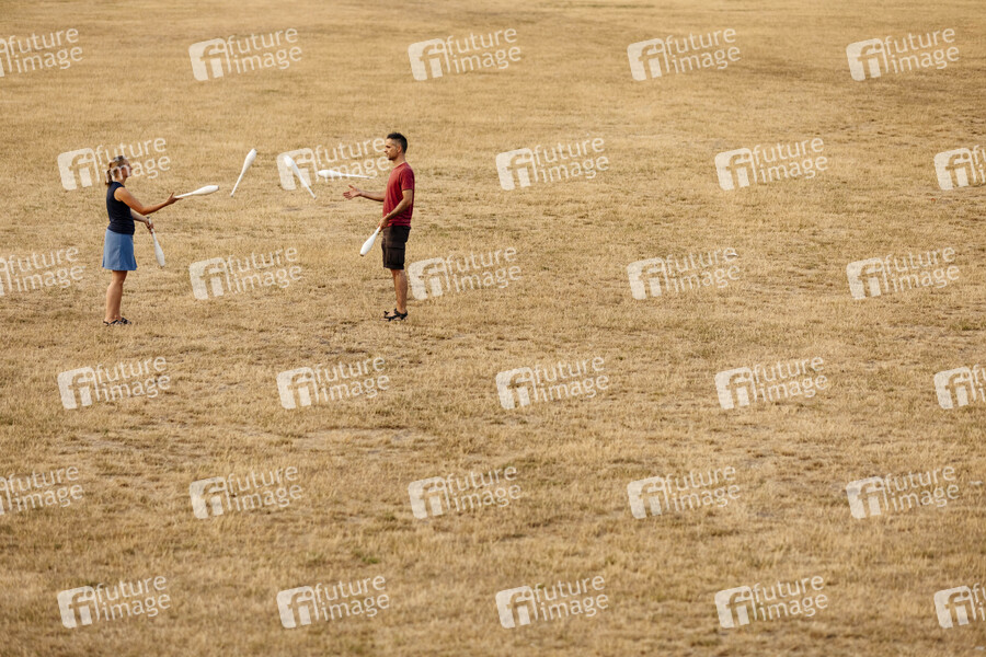 Jongleure auf einer verdorrten Wiese im Rheinpark. Köln, 25.07.2019