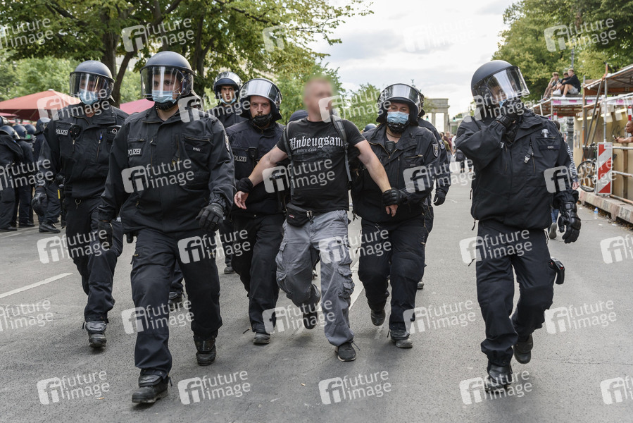 Coronaleugner, Verschwörungstheoretiker und rechte Gruppen der Initiative Querdenken protestieren mit einer Großdemonstration gegen die bestehenden Maßnahmen zur Eindämmung der Corona-Pandemie. Vor der russischen Botschaft an der Straße Unter den Linden kam es zu Auseinandersetzungen mit Polizeikräften. Wegen Nichteinhaltung der polizeilichen Auflagen wurde die Demonstration durch die Polizei beendet. Berlin, 29.08.2020