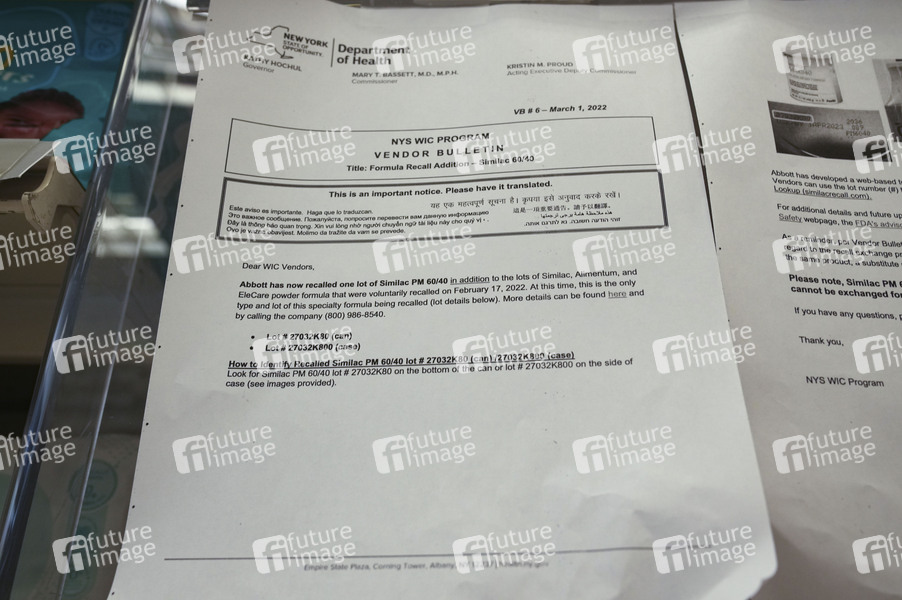 Fast leere Regale in der Babynahrungsabteilung eines Lebensmittelgeschäfts, Der Bürgermeister von New York City erklärt den Ausnahmezustand angesichts des landesweiten Mangels an Babynahrung, Dadurch wird die Befugnis gegeben , Preistreiberei für Babynahrung nach den New Yorker Regeln zu verhindern. Der landesweite Mangel an Säuglingsnahrung ist aufgrund eines freiwilligen Rückrufs bestimmter Pulvernahrungen durch Abbott Nutrition, nach Beschwerden, dass vier Babys, die Produkte aus der Pflanze konsumierten, an einer bakteriellen Infektion erkrankten, eskaliert. Zwei der Baby starben. New York, 22.05.2022