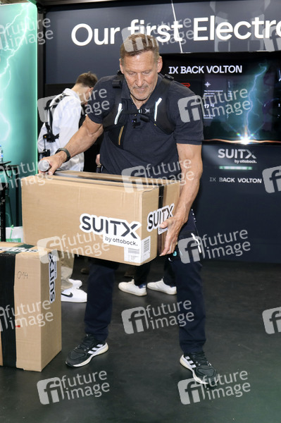 Ralf Moeller bei der Präsentation der Weltneuheit 'SUITX' am Stand des Medizintechnikunternehmens Ottobock auf der Hannover Messe 2025 auf dem Messegelände. Hannover, 31.03.2025