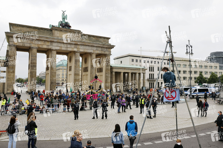 Im Rahmen einer Aktionswoche haben Klimaschutz-Aktivisten den Platz am Brandenburger Tor blockiert. Am frühen Morgen kletterten zudem mehrere Personen auf das Brandenburger Tor. Berlin, 20.08.2021