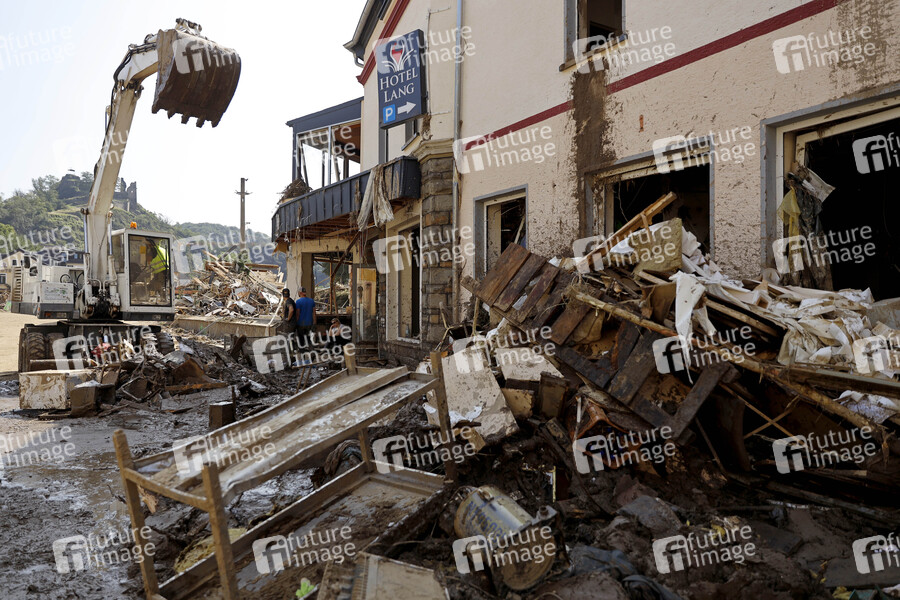 Nach dem Jahrhunderthochwasser in der Eifel durch heftige Regenfälle und Dauerregen mit Überschwemmungen und Überflutungen haben die Aufräumarbeiten im Ahrtal begonnen. Einheiten von Polizei, THW, Bundeswehr und Feuerwehr mitsamt vielen freiwilligen Helfern räumen Straßen, entfernen Schutt und Schlamm und versorgen die Menschen. Im Bild zerstörte Häuser in der Ortschaft Altenahr, in der die Flut viele Häuser zerstörte, 22.07.2021