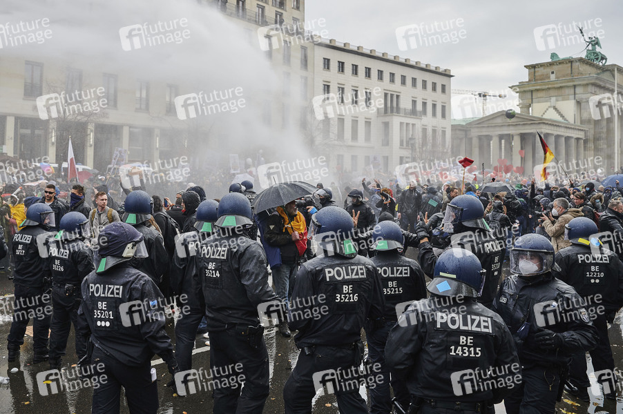 Tausende Demonstranten protestieren am Brandenburger Tor und im Regierungsviertel gegen die Corona-Politik der Regierung anlässlich der Bundestagsitzung zum Infektionsschutzgesetz. Die Polizei löst den Protest auf. Dabei kommt es zu Festnahmen, dem Einsatz von Wasserwerfern und Verstößen gegen die Maskenpflicht. Proteste in unmittelbarer Nähe des Bundestags waren zuvor untersagt worden. Berlin, 18.11.2020